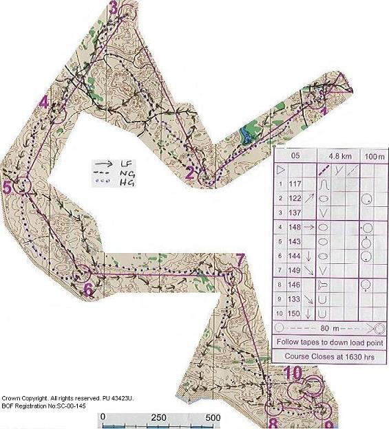 En route to the second control we discovered how difficult it is to adjust to the scale of 1:40000 when you normally run on 1:10000 or 1:15000 maps at orienteering events. We thought we had arrived at the right hilltop but in fact were well short of the control. However, we were always going in the right direction and eventually got the hang of the scale and found the control spot on. Thereafter, we would have no problems with navigation. One thing we did discover is that many features we might expect to find on an O' map such as large depressions simply weren't marked. Also, white screen is used for 'open' and not 'forest'. A vital skill is that of interpreting 15 metre interval contours.
