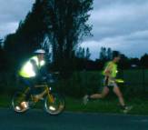 During the day the runner is accompanied by another member of the team on a bicycle. This gives them some protection from the traffic and also the possibility of having a drink on the leg as well as some encouragement. The other teams members stop at various points along the route to cheer the runner on. During the night legs the runner is also accompanied by a minibus to provide better visibility and protection from other traffic. On his arrival in Great Yarmouth, Rolf had the VIP treatment when he was accompanied by a motorcyclist and had the traffic stopped for him. I was the cyclist behind Tim on his leg through Thetford Forest at about 2:30am. The 1st 8 miles were on the road but then we turned onto the forest track, which was a little bit sandy in places and rather bumpy. I was riding a bike with road tyres. It started off ok, but as the track got more sandy and bumpy, I was struggling to keep up with Tim and wobbling more and more. Eventually I decided it was best to abandon the cycling, chuck the bike in the minibus and catch up with Tim who was by this time running with no lights in the pitch black. Steve (who is at least 6 foot tall) from the CUP running club thought he could do better. He leapt on the bike, which had the saddle set even lower than I like it, and managed to wobble even more than I had (I'm sure his knees must have been hitting the handle bars!). He eventually gave up too and we had to drive at 40 miles an hour in the minibus over this bumpy, sandy forest track to catch up with Tim who was beginning to think the minibus had broken down and abandoned him.
